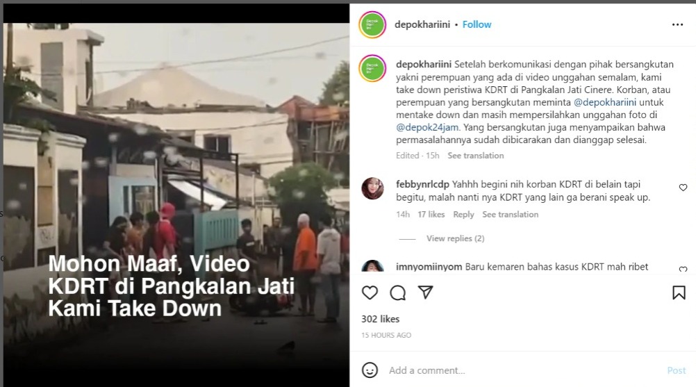 “Setelah berkomunikasi dengan pihak bersangkutan yakni perempuan yang ada di video unggahan semalam, kami take down peristiwa KDRT di Pangkalan Jati Cinere,” tulis akun tersebut di kolom caption.