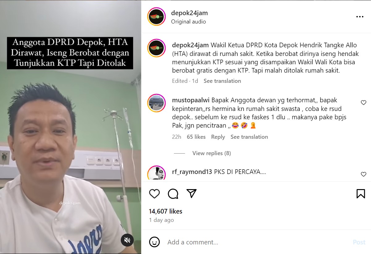 “Saat ini saya sedang berobat di RS Hermina karena sedang sakit,” ucap Hendrik Tangke Allo dikutip dari tayanga video yang diunggah akun Instagram @depok24jam.