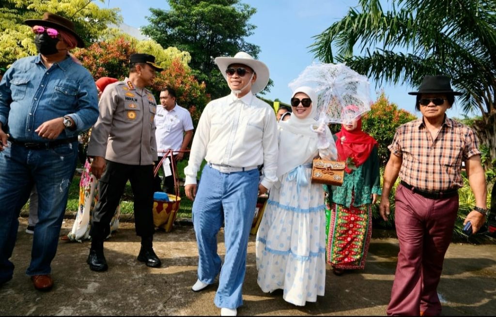 Tak mau kalah dengan Wali Kota, anggota DPRD Jawa Barat, Pradi Supriatna dan istri juga tampil nyentrik mengenakan kemeja denim, rambut palsu warna pink dan celana cutbray. Sedangkan istrinya yaitu Martha mengenakan dress bermotif bunga.