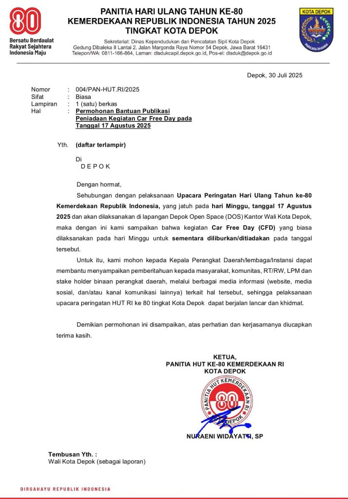“Sehubungan dengan pelaksanaan Upacara Peringatan Hari Ulang Tahun ke-80 Kemerdekaan Republik Indonesia, yang jatuh pada hari Minggu, tanggal 17 Agustus 2025 dan akan dilaksanakan di lapangan Depok Open Space (DOS) Kantor Wali Kota Depok, maka dengan ini kami sampaikan bahwa kegiatan Car Free Day (CFD) yang biasa dilaksanakan pada hari Minggu untuk sementara diliburkan/ditiadakan pada tanggal tersebut,” kata Nuraeni dalam suratnya, Kamis (31/7/2025).