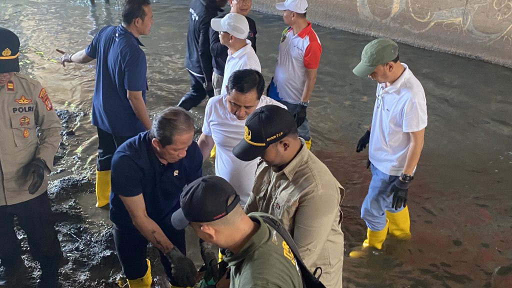 DEPOK– Menteri Lingkungan Hidup (LH), Hanif Faisol Nurofiq bersama Wakil Wali Kota Depok Chandra Rahmansyah turun ke Sungai Cipinang di Kecamatan Cimanggis, Depok untuk membersihkan sampah. Terkumpul hampir 3 ton sampah di dua titik yang kerap dijadikan lokasi pembuangan sampah liar oleh warga.