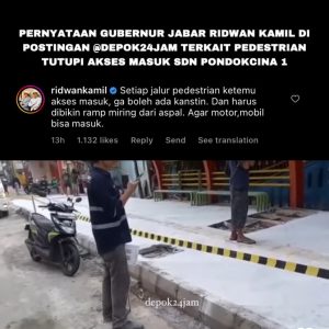 DEPOK24JAM, – Gubernur Jawa Barat Ridwan Kamil buka suara soal viralnya proyek revitalisasi trotoar Jalan..
